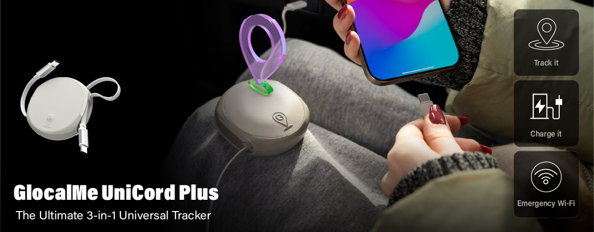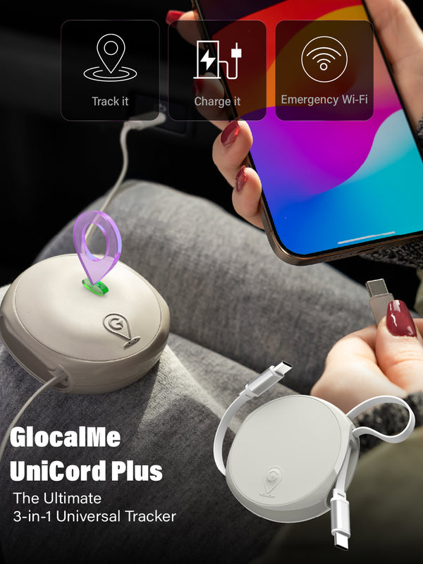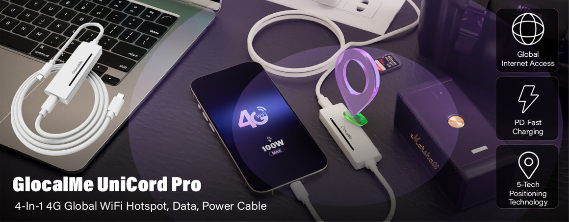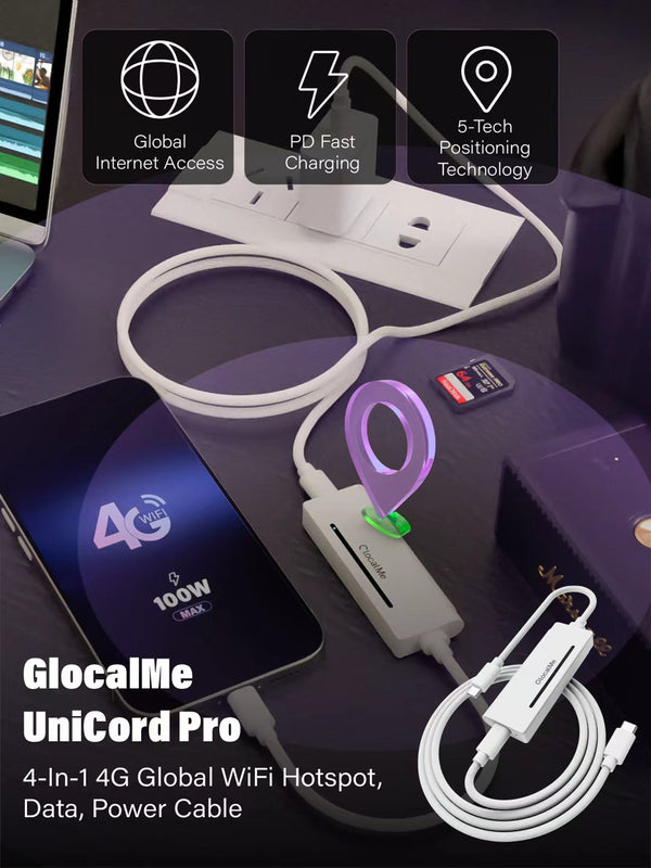 Fast Charging: GlocalMe's Unicord Series, exemplified by the UniCord Pro, delivers versatile functionality by integrating a charging cable and WiFi dongle into one device — serving as a WiFi hotspot, charger, and GPS locator, with data transmission support for seamless CarPlay connection. Keeps you connected, powered, and on track.