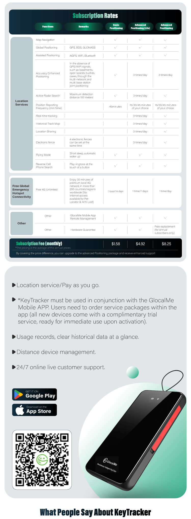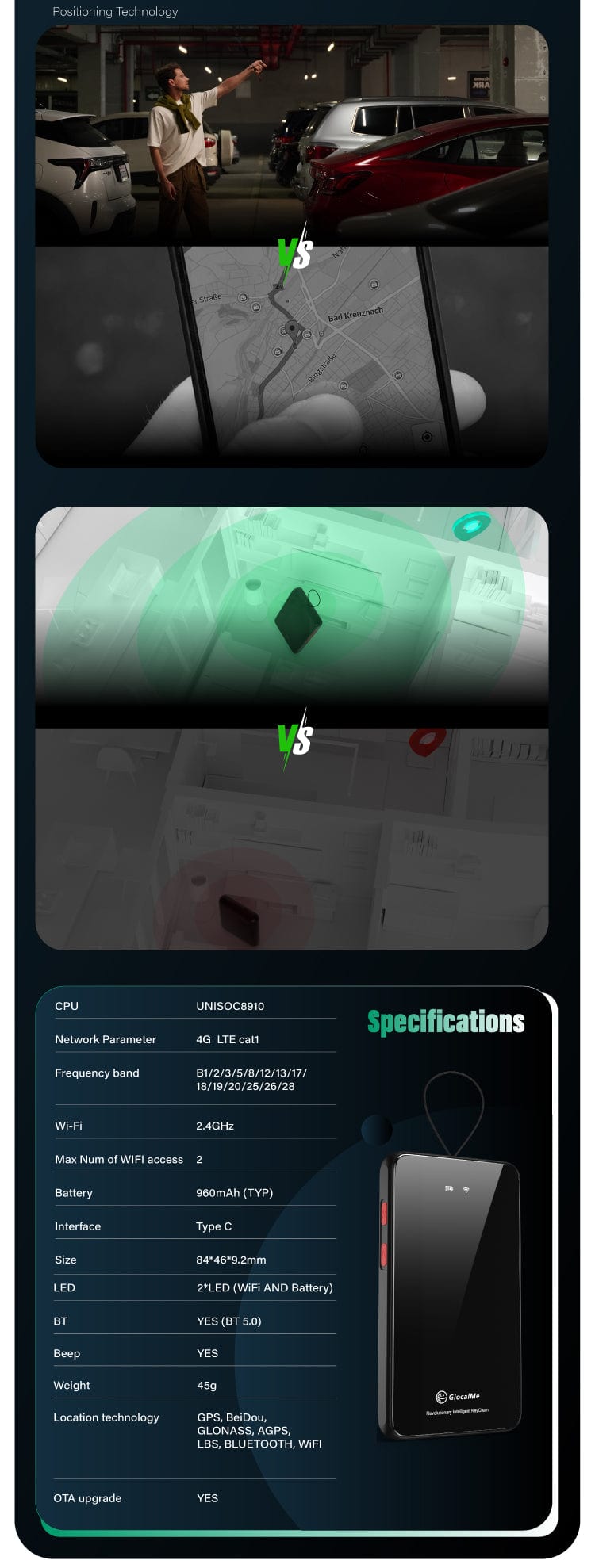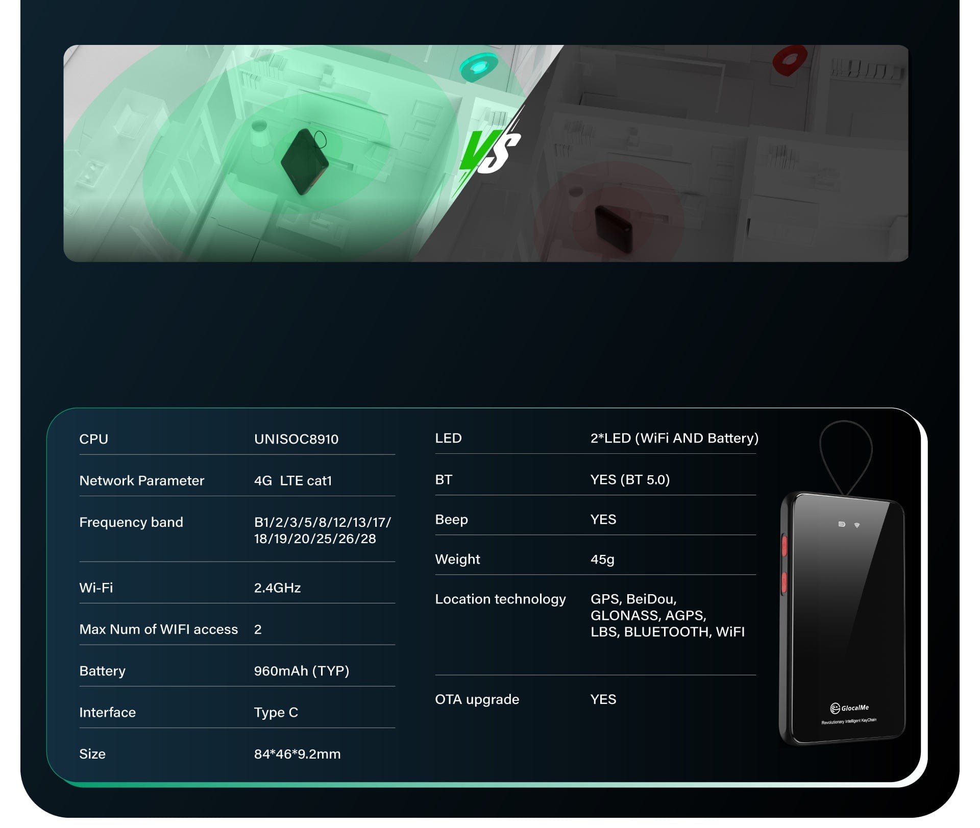 Glocalme KeyTracker uses Cloud SiM technology for global location services, supporting 6 types of location technology including GPS, AGPS, LBS, Bluetooth, WiFi, and active radar.